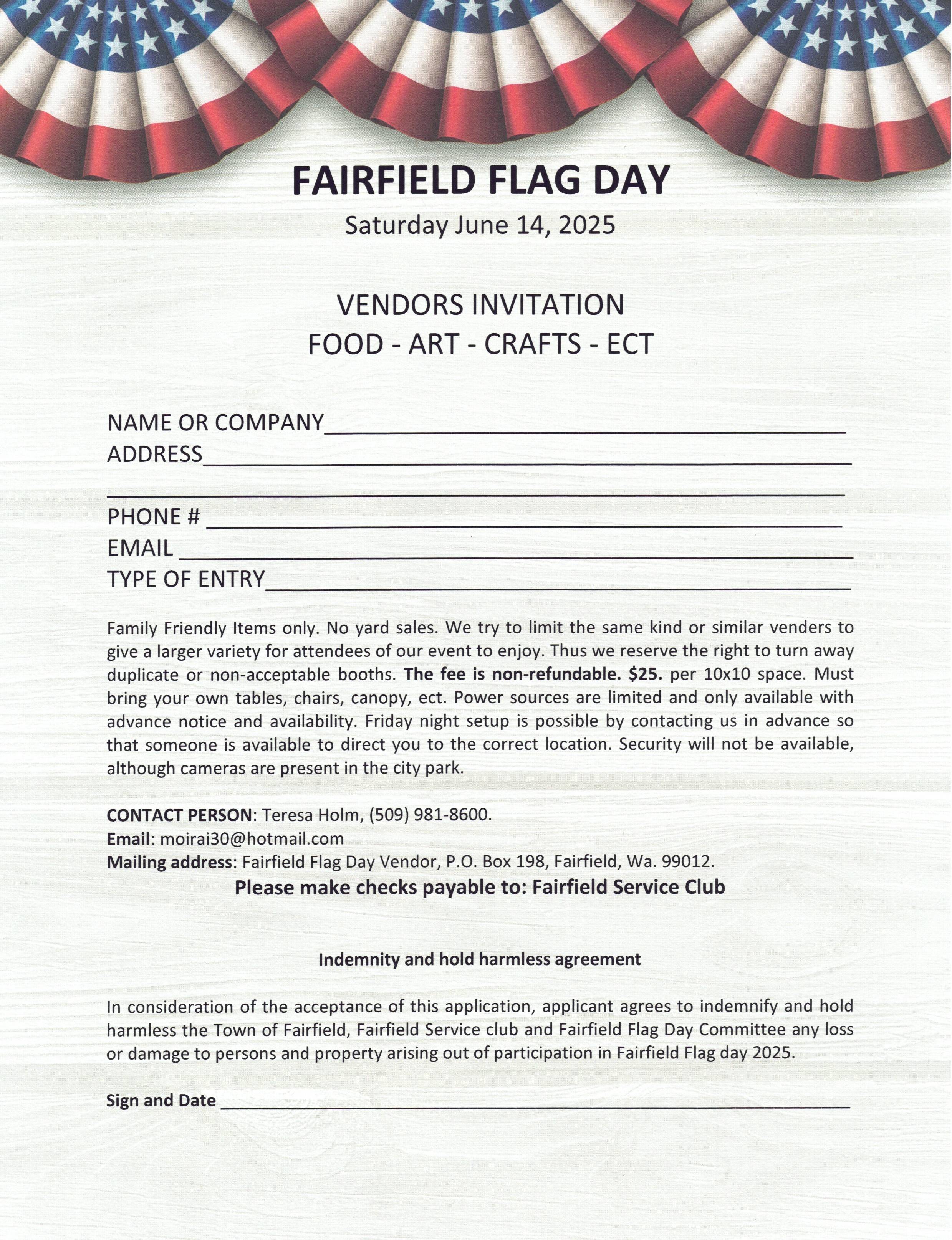 Thank you for your interest in being a Vendor for Flag Day. We are excited at growing our vendors and the assortment of items they have to offer. For Vendor information regarding Vendors, Food, and Crafts, please print the Vendor Form and submit as instructed. You can also contact Teresa Holm (509-981-8600). Please be sure to check back for our new Vendor Page that will be updated as our Vendors book their booths.